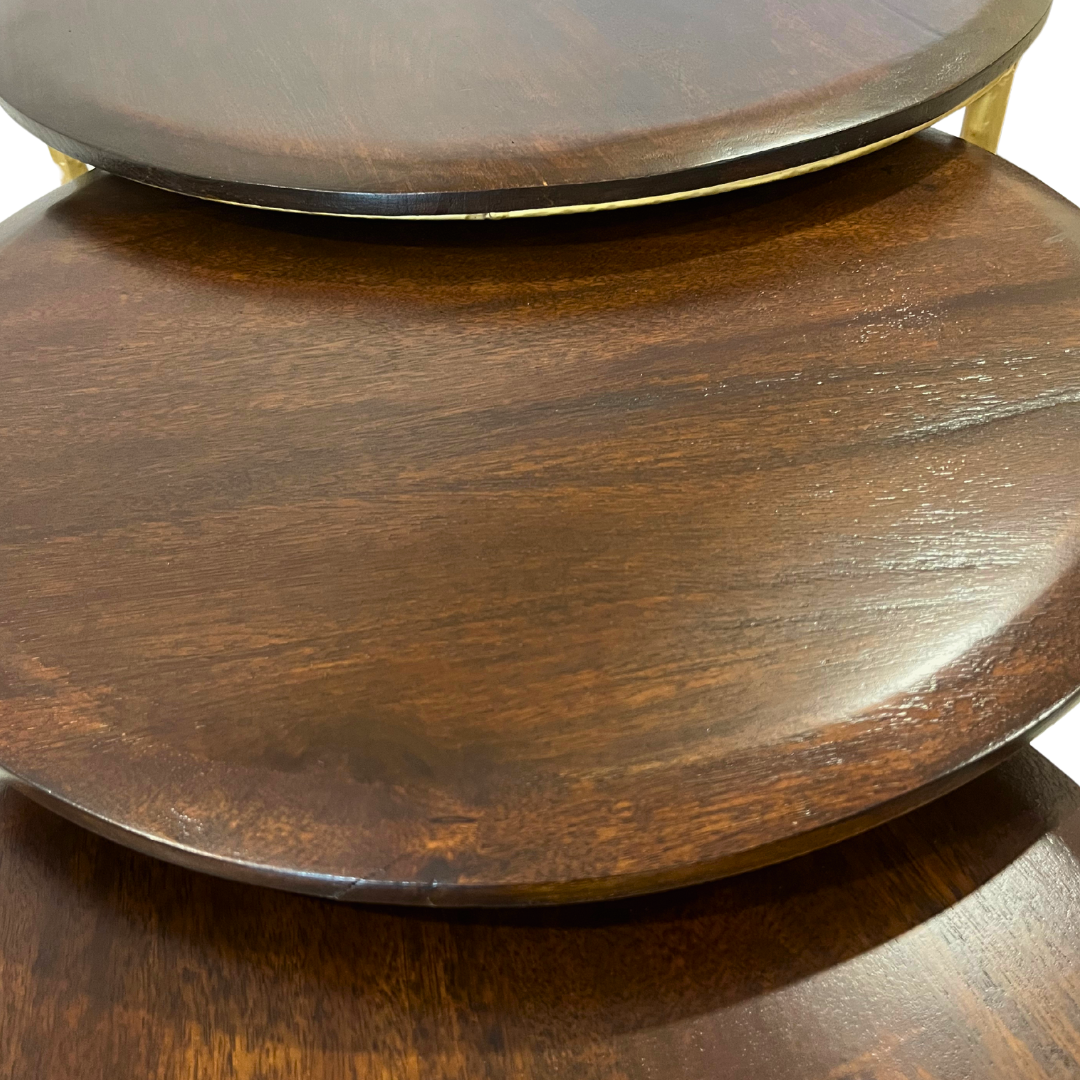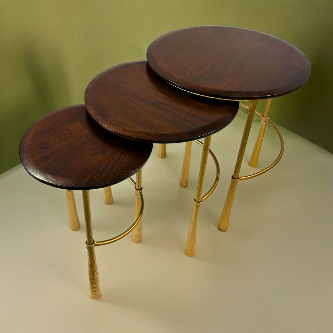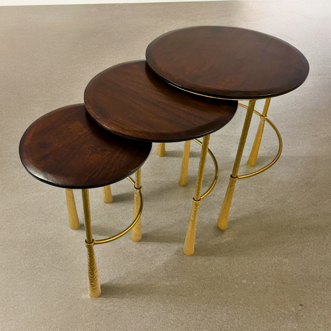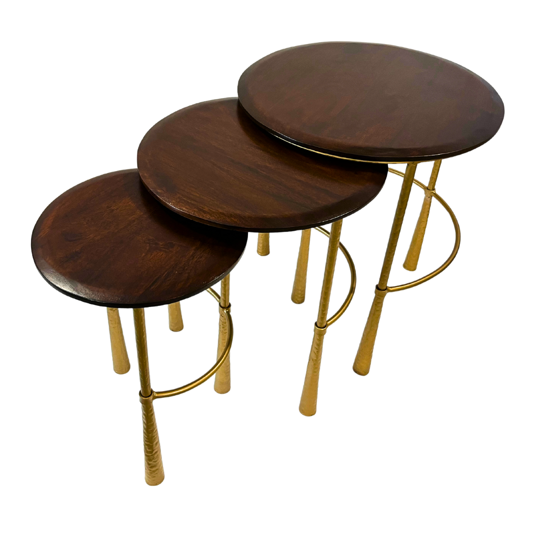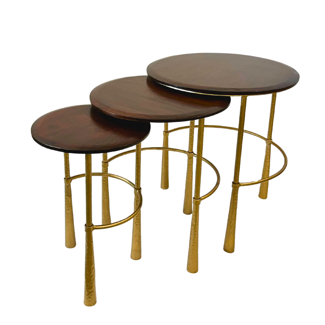 This nesting table set stuns with a rich walnut top and gleaming gold, hammered metal legs. Nest them for a statement side table, or separate them for versatile use throughout your home.